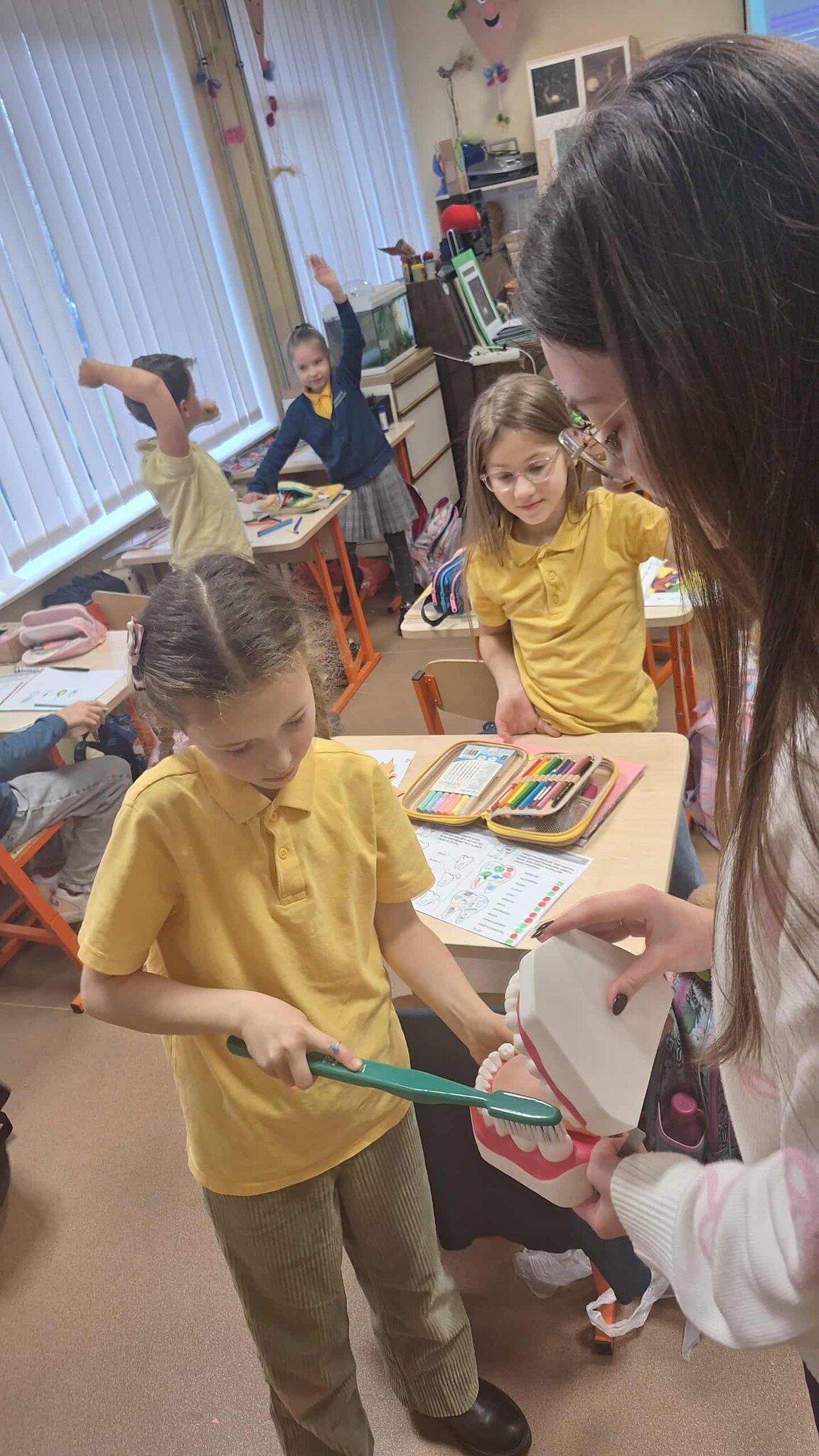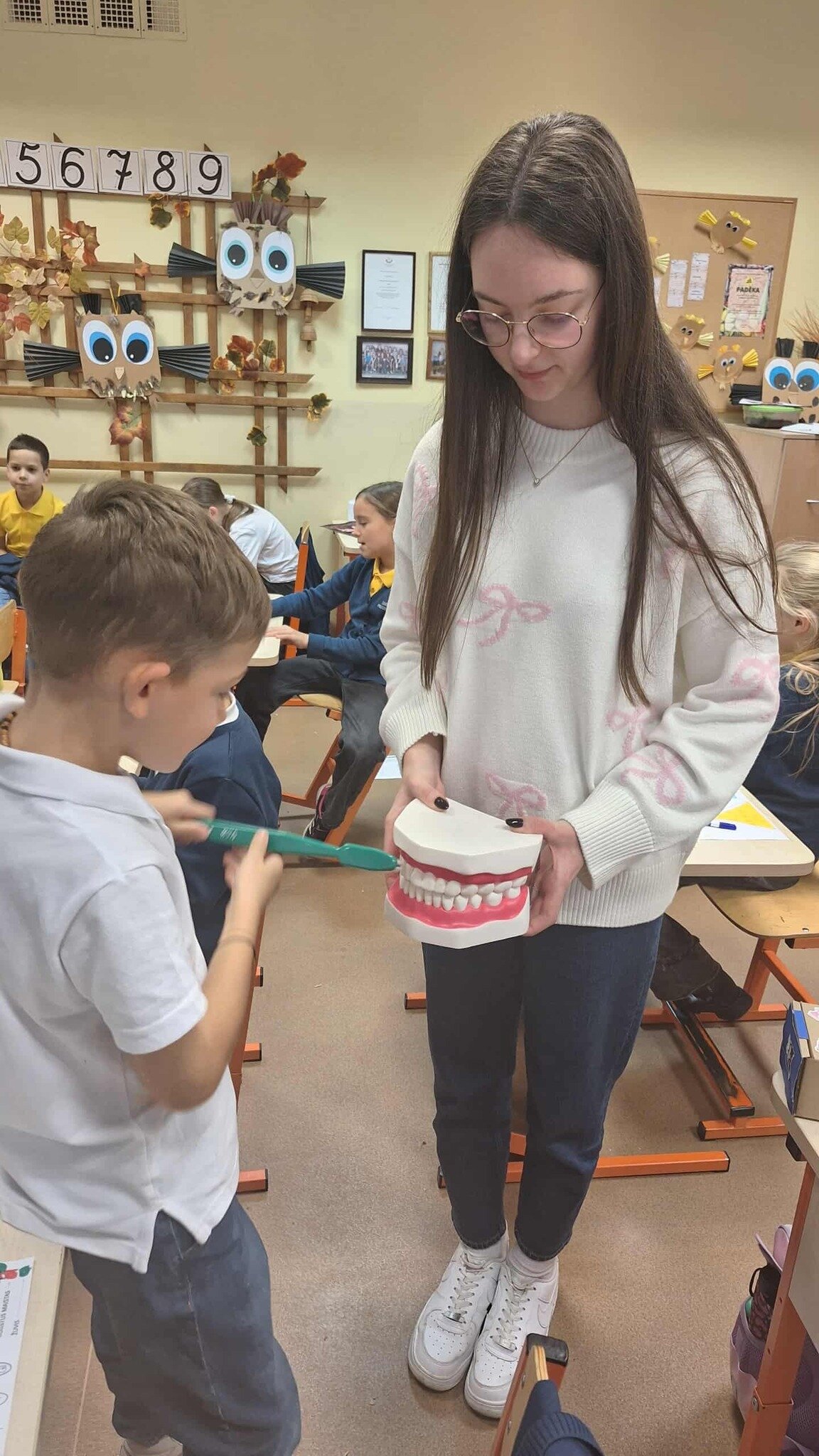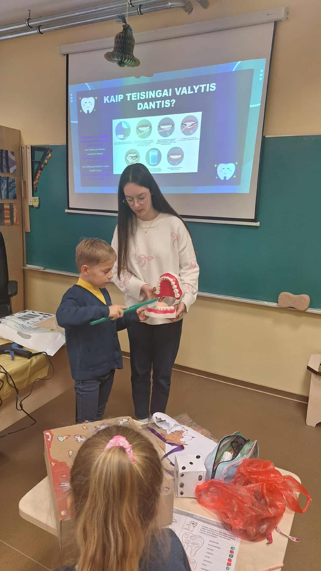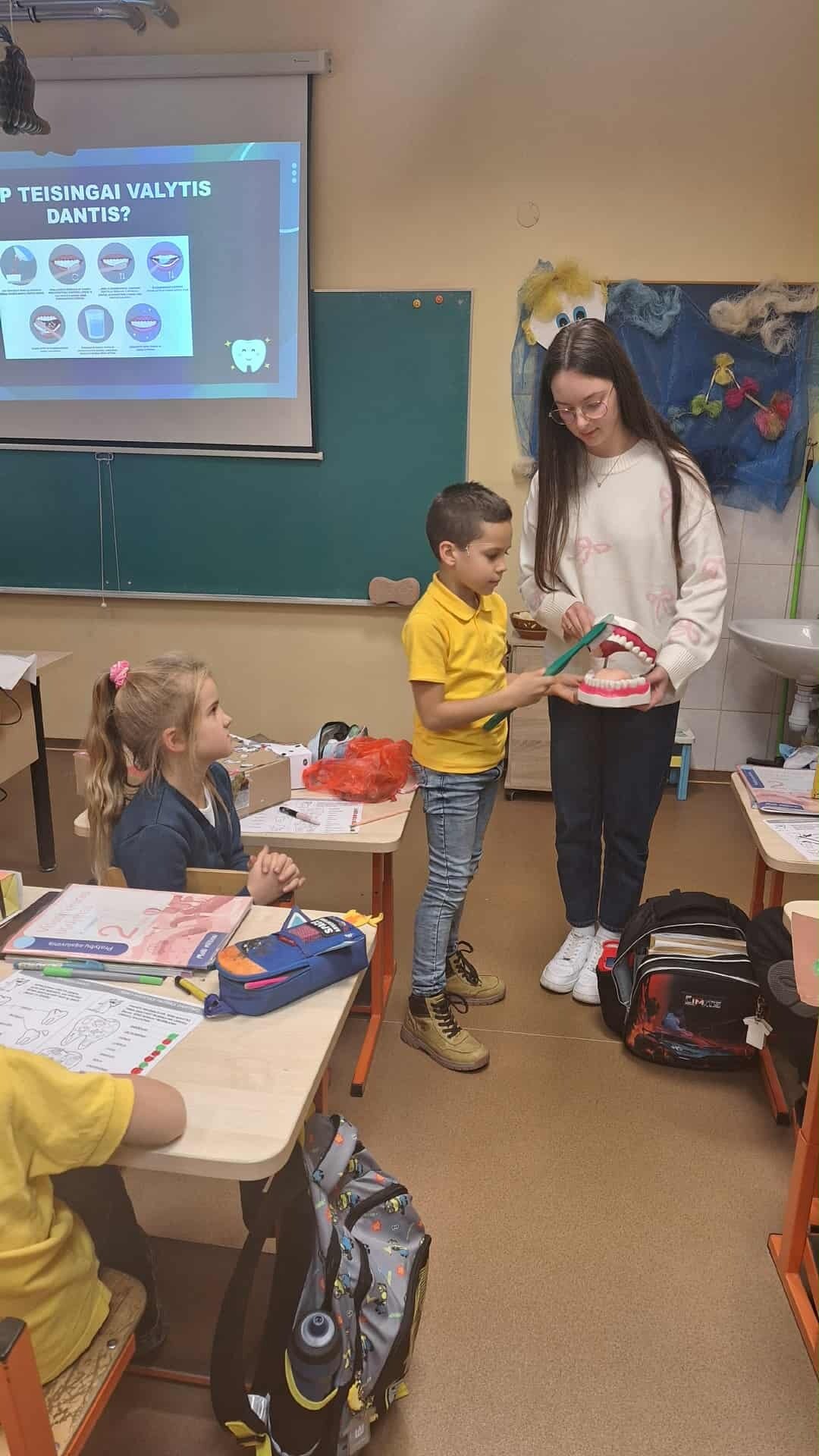 Spalio 23 dieną antrokai dalyvavo įdomiame ir naudingame užsiėmime, kurį vedė visuomenės sveikatos priežiūros specialistė Gabija. Užsiėmimo metu mokiniai sužinojo, kiek ir kokių dantukų turi žmogaus burna, kokias funkcijas atlieka kiekvienas dantukas bei kodėl svarbu juos prižiūrėti. Taip pat diskutuota apie burnos priežiūros priemones, apie tai, kodėl kartais skauda dantis ir ką tokiu atveju reikia daryti, bei kokį maistą dantukai „mėgsta“. Praktinė užsiėmimo dalis ypač patiko mokiniams – kiekvienas turėjo galimybę pademonstruoti taisyklingą dantų valymą, naudodamas specialų dantų modelį. Tai leido mokiniams ne tik išgirsti teoriją, bet ir įgyti praktinių įgūdžių. Pamokėlės pabaigoje visi mokiniai už aktyvų dalyvavimą gavo dovanų dantukų valymo kalendorių. Užsiėmimas padėjo vaikams įgyti naujų žinių, įgūdžių ir motyvacijos kasdien rūpintis savo dantimis, o svarbiausia – suprasti, kad švari burnytė reiškia gražią ir sveiką šypseną.